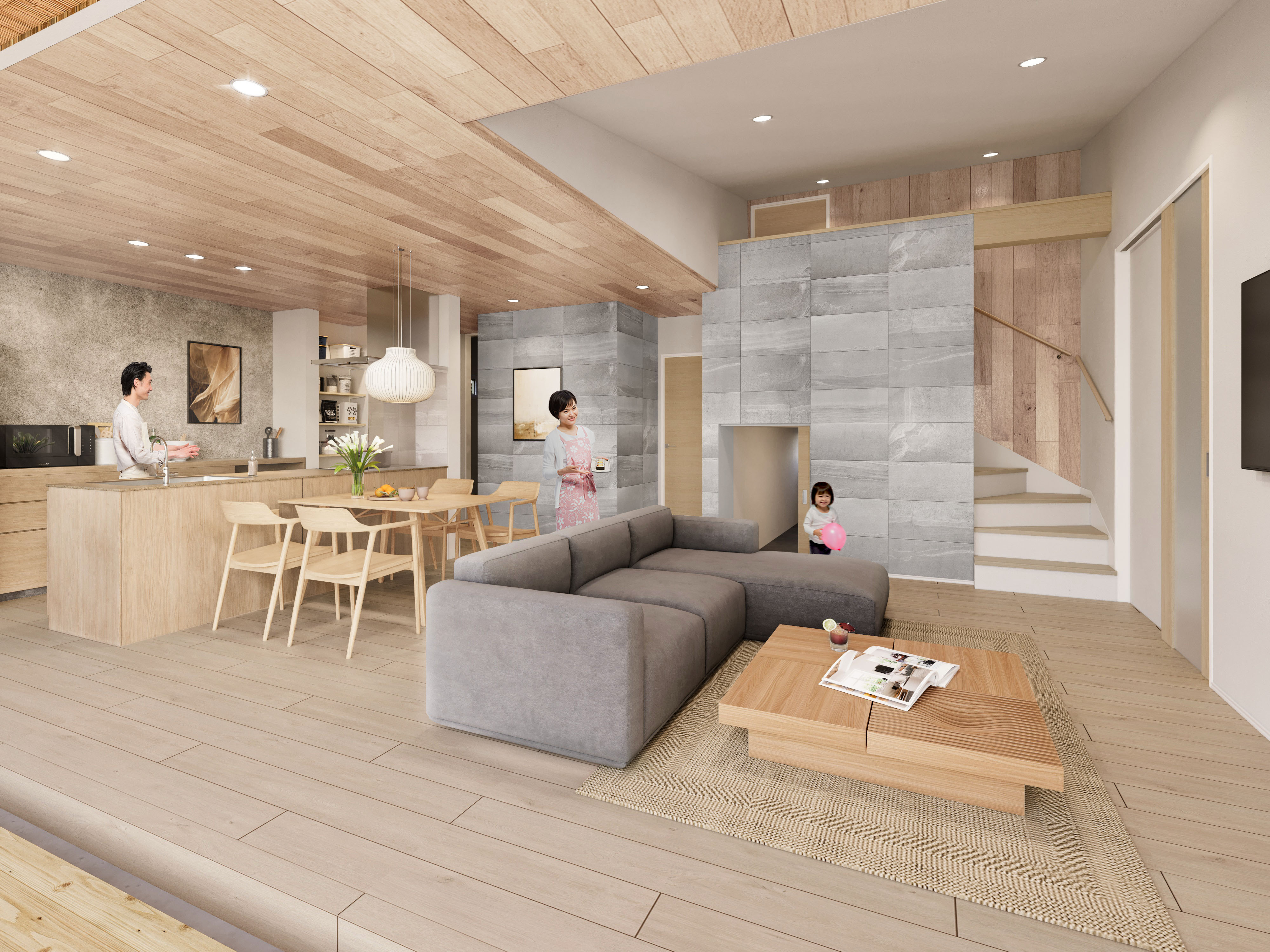 FLAT-Xの最大の特徴は標準搭載された「Skipフロア」。一部の部屋を1.5階に上げることで立体的でおしゃれな構造に。さらにその下に生まれた空間は、収納としての利用だけでなく、お子様の遊び場にも大活躍。それでいて「ワイドスパン」を採用しているので、通常より大きいLDKはアイランドキッチンにできちゃうほど広々空間です。ほかにも「ビルトインガレージ」など人気の機能も搭載しており、お客様の「欲しい!」が随所に詰まっています。