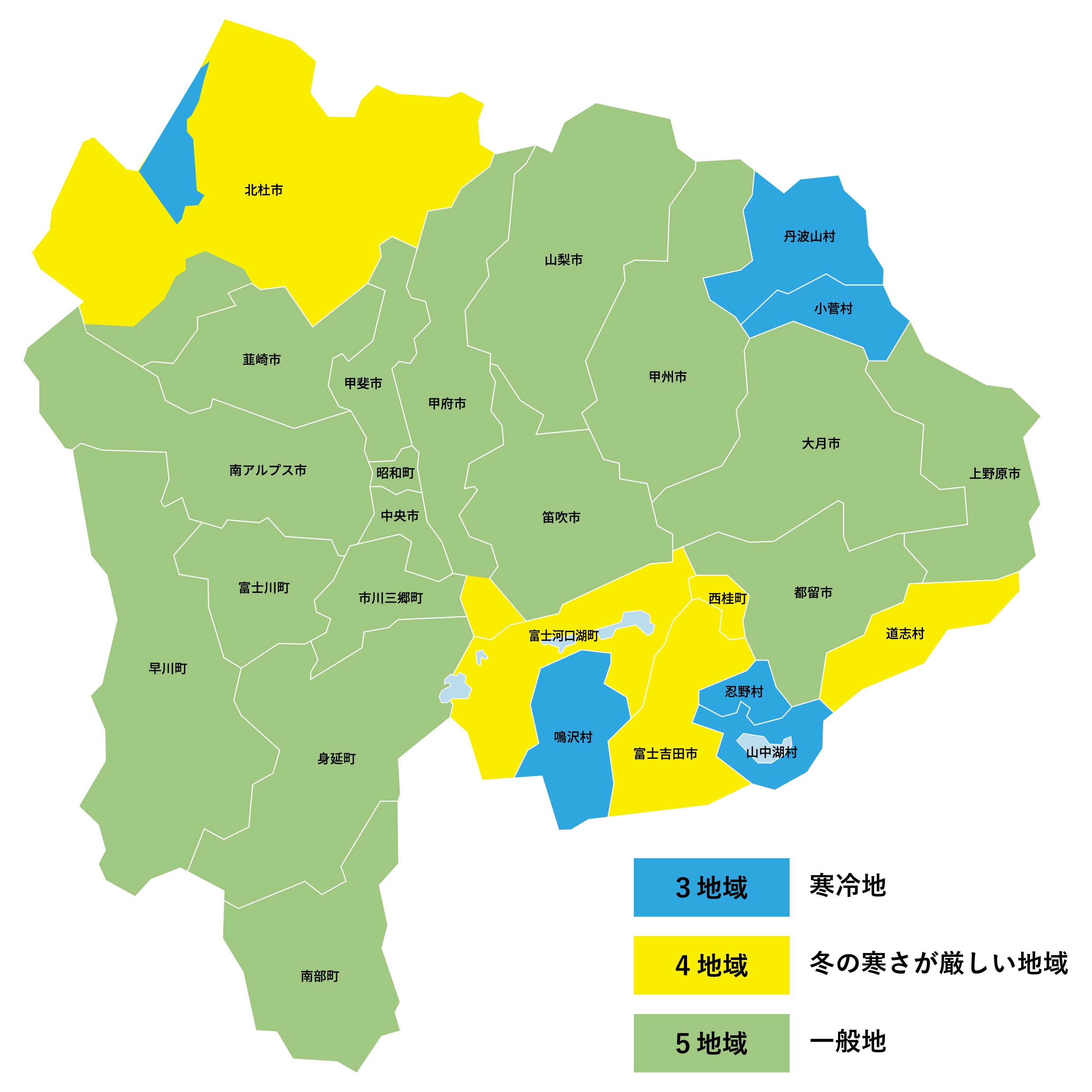 山梨県はエリアによって「3地域(寒冷地)」、「4地域(冬の寒さが厳しい地域)」、「5地域(一般地)」が混在しています。3地域は北海道や青森と同じなので、かなり寒いと言えるでしょう。
