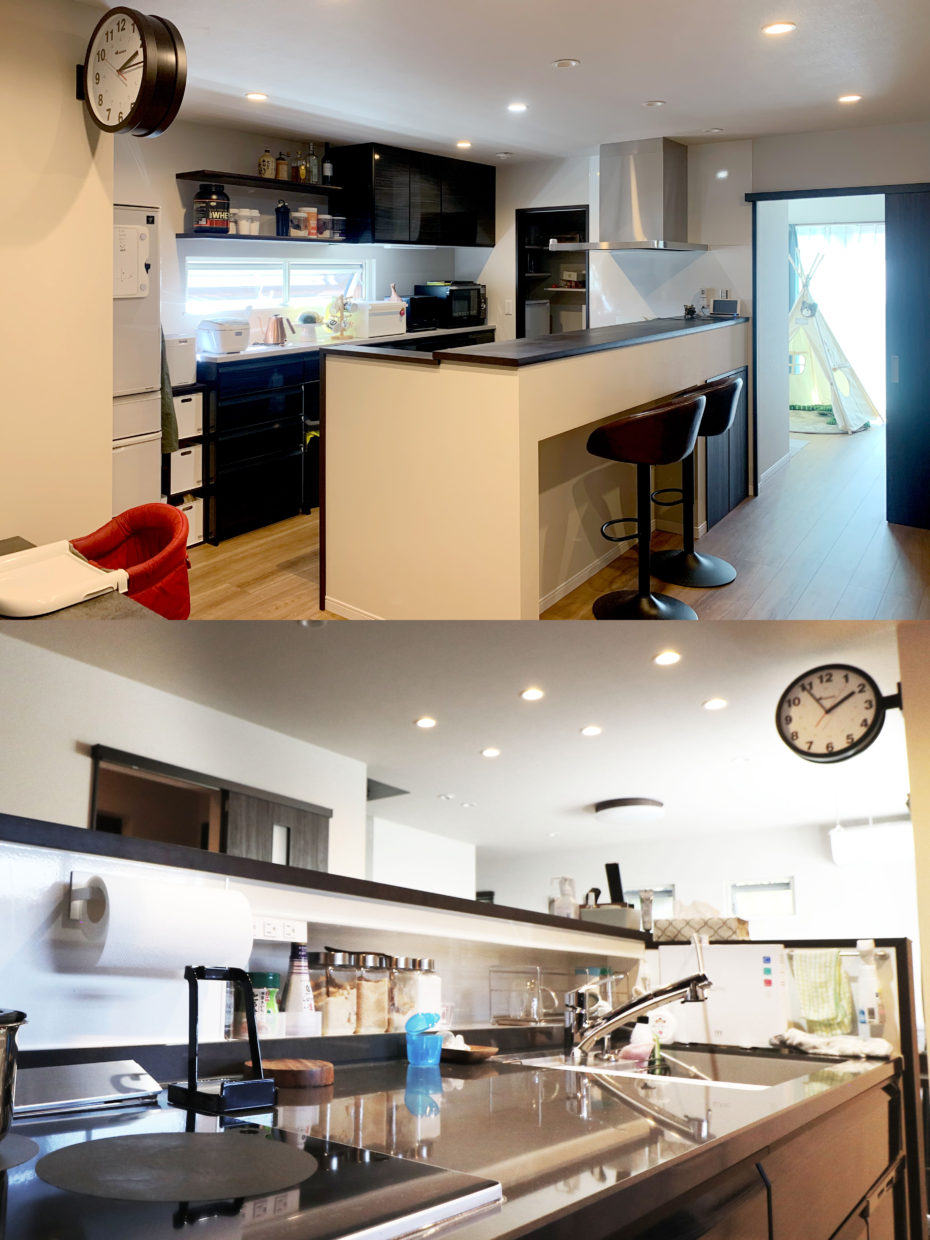 キッチンには造作の対面カウンターをつけました。カウンター越しに旦那さまやお子さんたちとお話しながらキッチンでご飯の支度や片付けをしたいという、奥さまのこだわり。働くお母さんにとって朝は戦争。お子さんがもう少し大きくなったら、朝食はカウンター席で食べさせて、出勤や登校にバタバタする朝のキッチンまわりの家事を効率よく回したいとのこと。