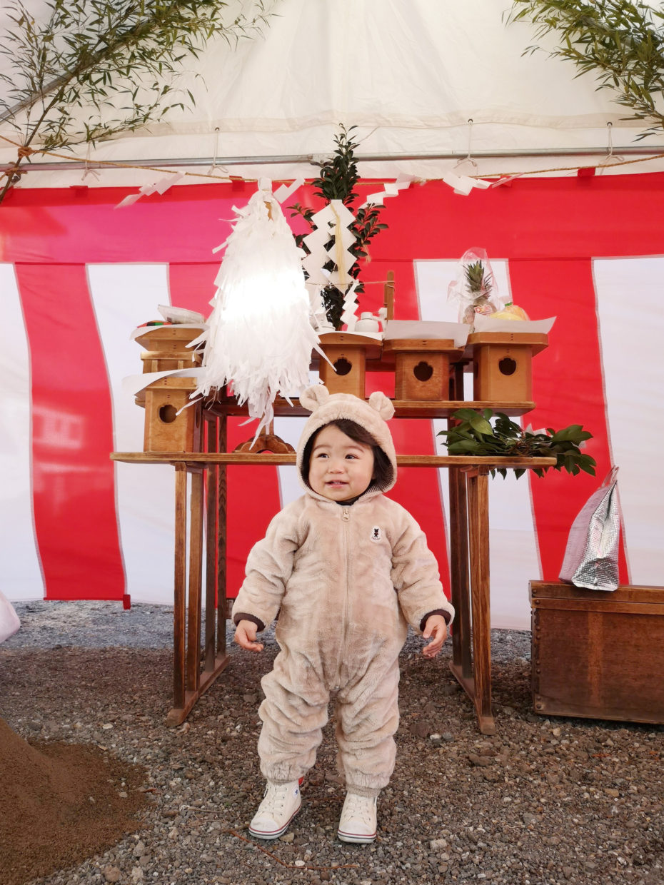 いよいよマイホームづくりが本格的に始まり、地鎮祭が行われました。地鎮祭とは、土地の神様を祭り工事の無事を祈る祭事です。お施主さんと施工主が行う鍬入れの際、施主である旦那さまは思い切り声を張り上げて「エイッ!エイッ!エイッ!」と掛け声をかけました。その威勢の良さには施工主もびっくり。「これまで数え切れないほど地鎮祭を見てきましたけど、これまでで1番の鍬入れでした!」と現場監督と営業担当が口をそろえたそうです。家づくりの良いスタートがきれました。