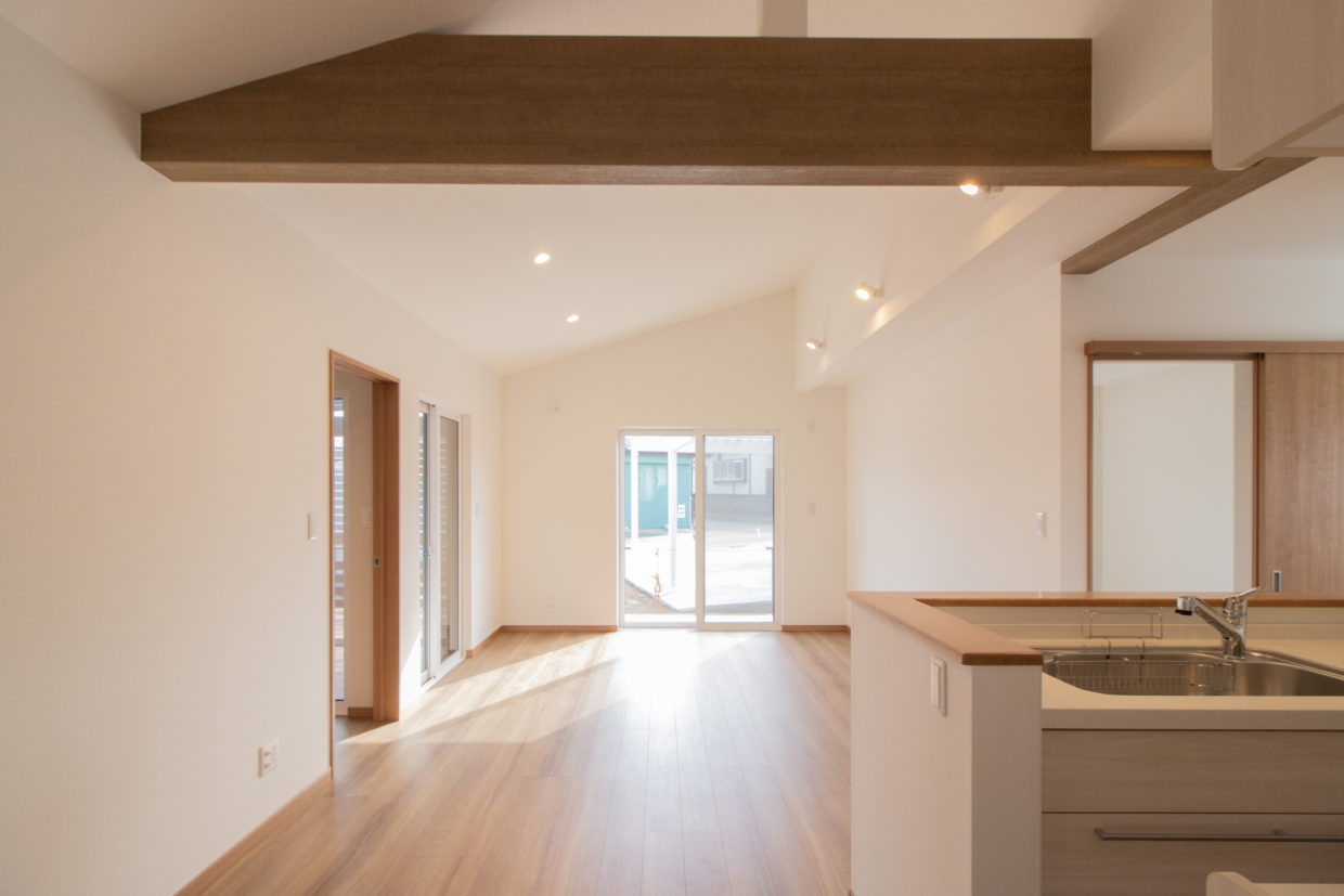 開放感のあるワンフロアのLDKが魅力。憩いの時間を過ごされているそう。勾配天井や表し梁、間接照明など細部にまでこだわりを感じました!※写真は竣工時のもの