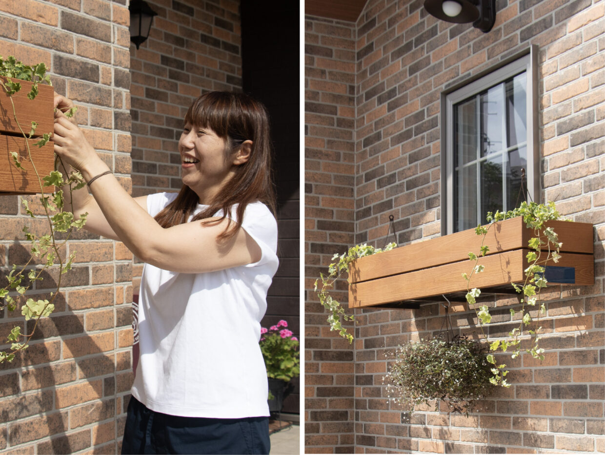 レンガ調の外観にマッチしたウィンドウボックスは奥さまのお気に入りのひとつ。実家からお裾分けしてもらったお花や植物を育てているそう。他にも土間やトイレの内装は奥さま指定の壁紙を使用しており、毎日が明るくなったとのこと。